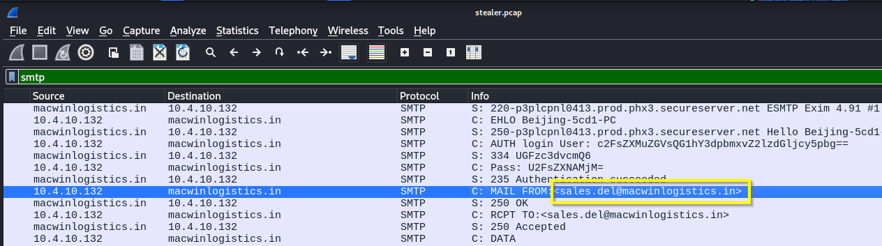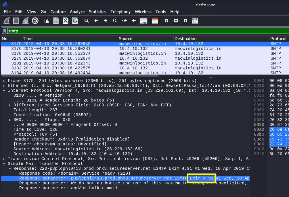 Q: Analyzing the first extraction of information. What software runs the email server to which the stolen data is sent?