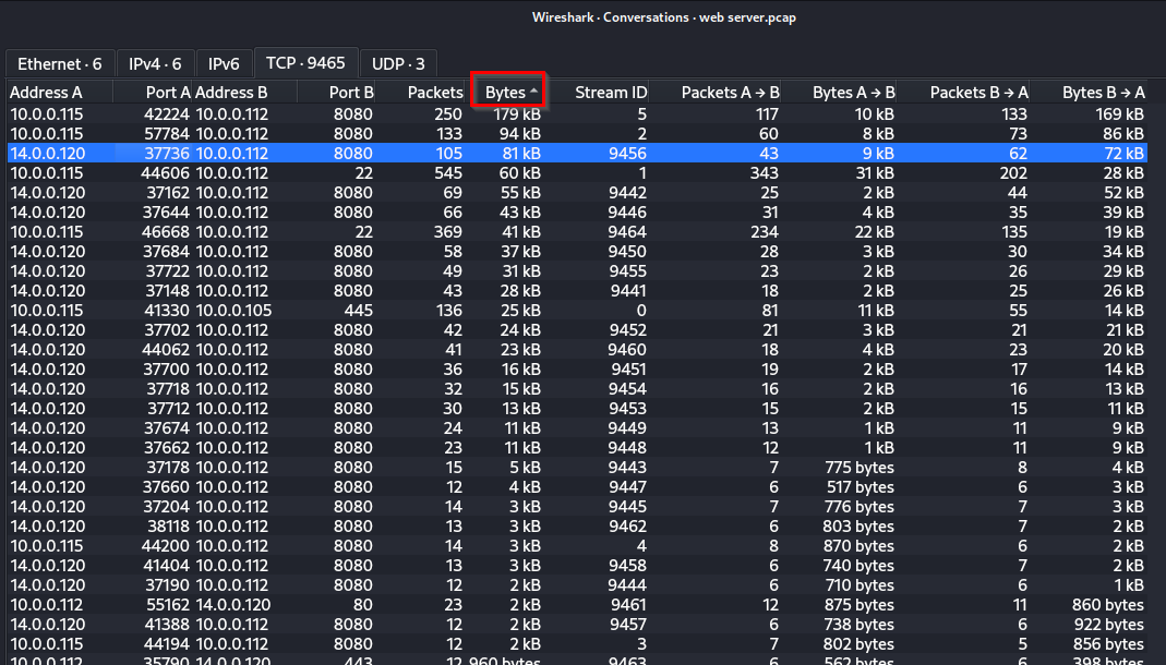 Q: From the pcap analysis, multiple open ports were detected as a result of the attacker’s activitie scan. Which of these ports provides access to the web server admin panel?