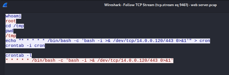Q: Upon successfully establishing a reverse shell on our server, the attacker aimed to ensure persistence on the compromised machine. From the analysis, can you determine the specific command they are scheduled to run to maintain their presence?